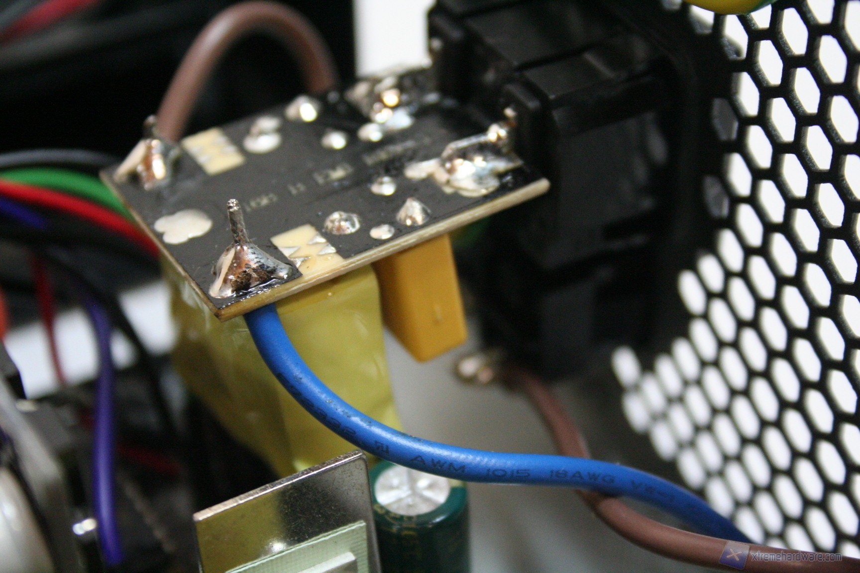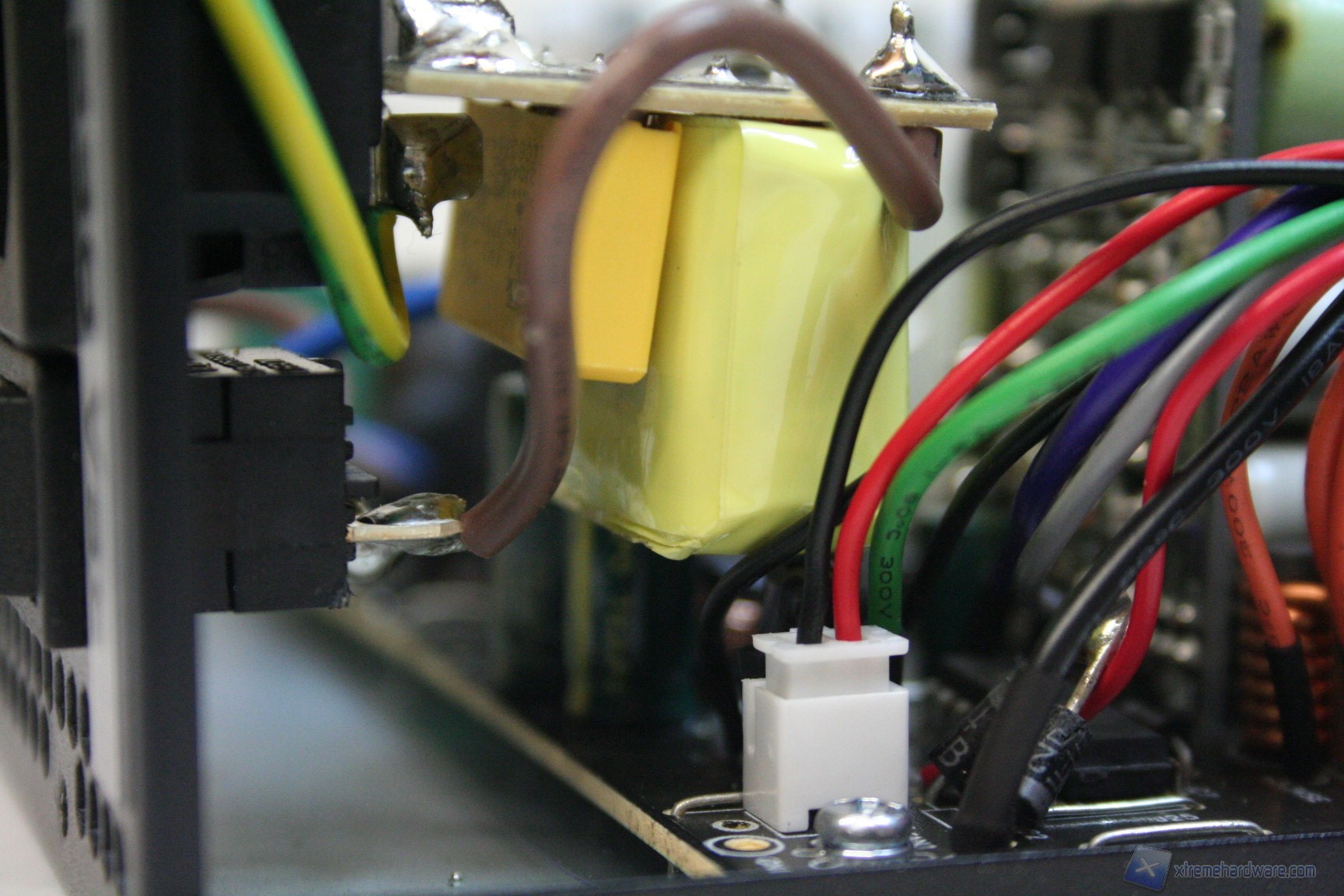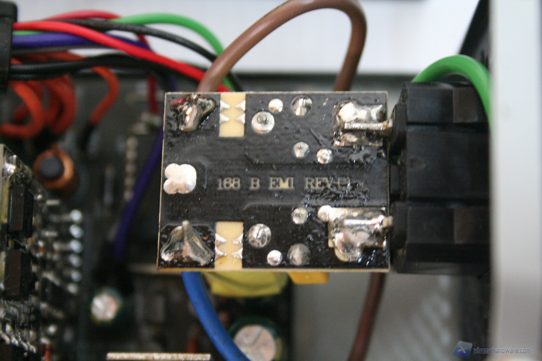 Il primo elemento di un alimentatore moderno è il sistema di filtraggio delle emissioni elettromagnetiche e radio, precisamente l’EMI/RFI Transient Filter. Viene posizionato necessariamente dietro all’ingresso della corrente AC e sono state incluse le necessarie componenti affinché non ci siano interferenze elettromagnetiche, tra cui un condensatore ad X ed un induttore sul PCB superiore, un condensatore ad X su quello principale ed un altro induttore e sempre su quest’ultimo troviamo due condensatori ad Y, oltre ad un varistore (MOV, Metal Oxide Varistor) ovvero sostanzialmente una resistenza, voltaggio-dipendente, che protegge l’alimentatore ed il sistema da picchi di voltaggio provenienti dalla rete elettrica esterna. Vi ricordiamo che se un alimentatore non è dotato di un MOV nell’EMI/RFI Transient Filter si dovrebbe sempre utilizzare il proprio sistema con un gruppo di continuità (o UPS), che agirà da filtro a protezione dei picchi di voltaggio; questi ultimi potrebbero danneggiare seriamente non solo l’alimentatore stesso ma anche l’intero sistema! Di solito questa componente viene rimossa per ragioni di costo di produzione, e progettazione.