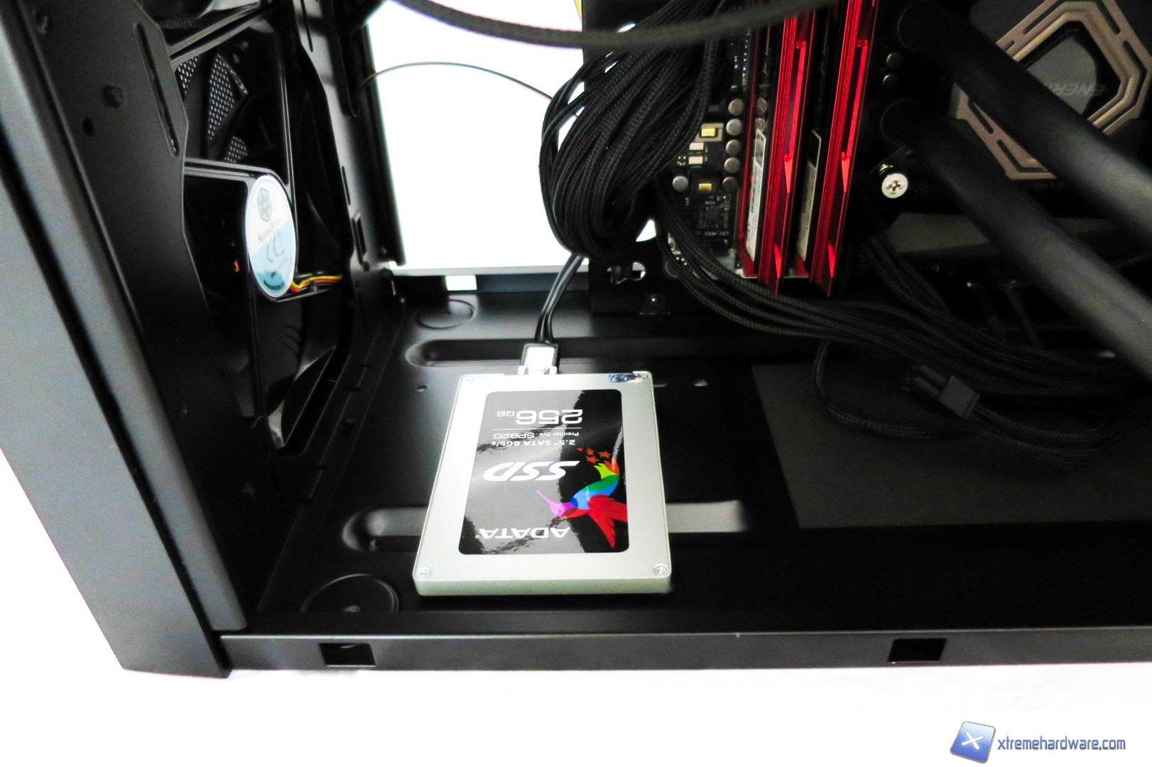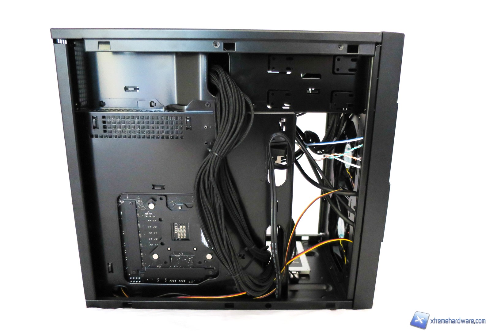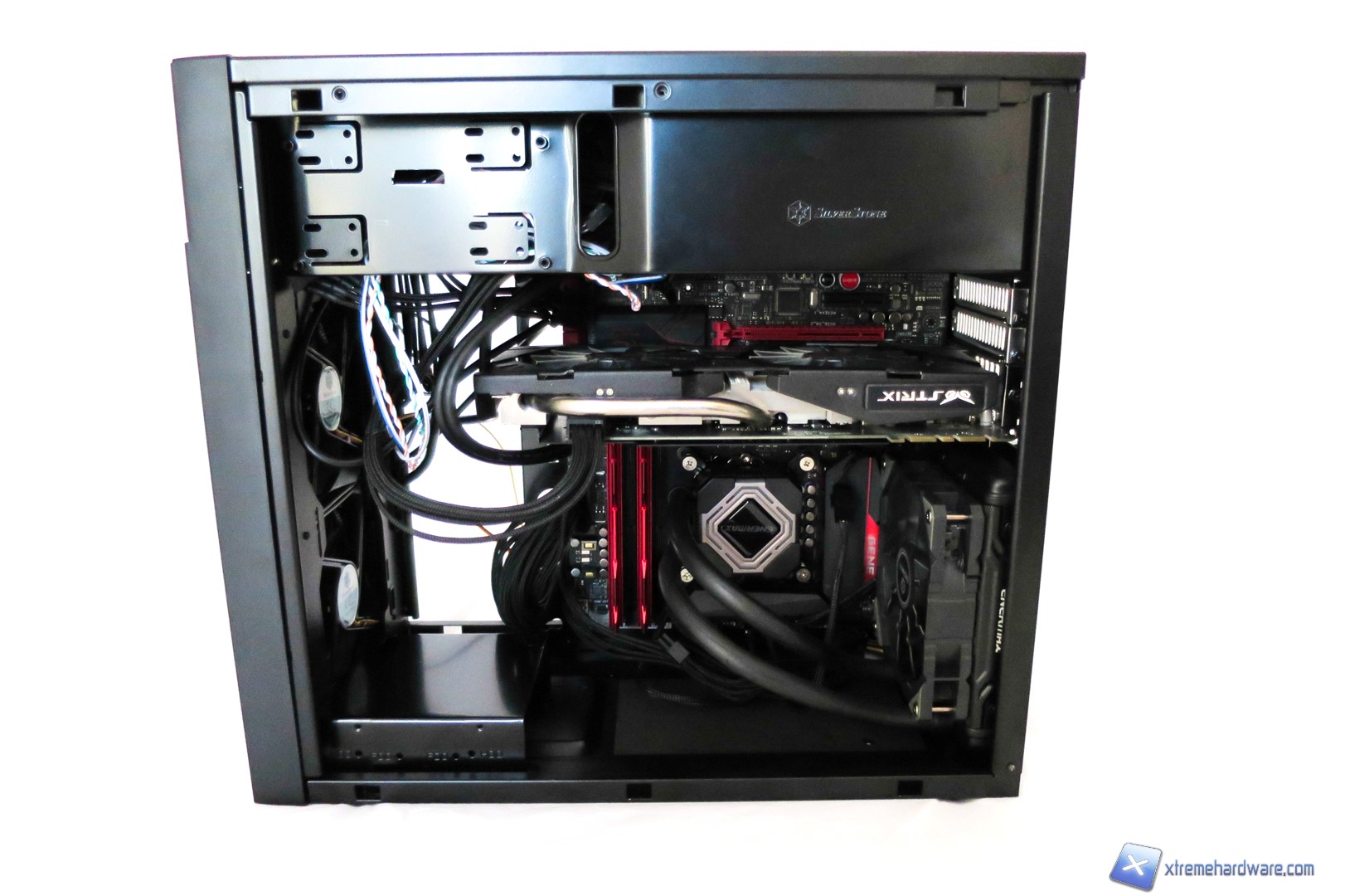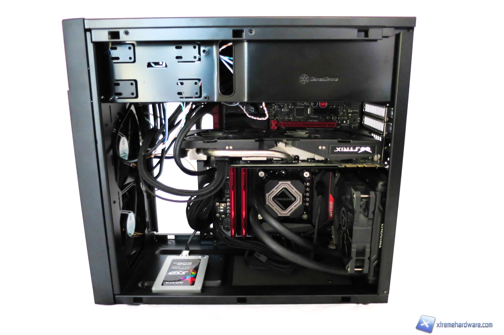 Siamo dunque passati alla fase di installazione della nostra consueta configurazione. Come noteremo dalle immagini, lo spazio offerto dal SilverStone KL06 è adeguato e risulta valido salvo operare con calma e accortezza. Nel Kublai KL06 non abbiamo avuto grosse difficolta ad installare la GTX 970 salvo la rimozione del cage per gli SSD/Hard Disk per avere maggior possibilità di cablaggio e spazio di manovra. Ricordiamo comunque che il cage non interferisce con le schede video e la nostra è stata solo una esigenza volta ad avere maggior spazio di operatività. Anzi, come riportato da SilverStone stessa, tale cage in plastica potrà fungere anche da sostegno nel caso in cui si adottassero delle schede video abbastanza pesanti a causa di dissipatori custom. Per questa configurazione abbiamo utilizzato anche un dissipatore AIO con radiatore da 120mm che potremo installare in configurazione Push/Pull qualora ne avreste necessità. Noi abbiamo preferito utilizzarlo in configurazione Push. Come vediamo i fori per il passaggio dei cavi sono posizionati in maniera corretta e dunque avremo facile accesso ai diversi componenti. Non manca la possibilità di installare un SSD nella parte inferiore del case al posto del cage precedentemente rimosso. Nel complesso siamo soddisfatti anche perché il posizionamento dell’alimentatore nella parte superiore in una zona separata permetterà, nell’eventualità di non installare unità ottiche, di effettuare un cablaggio superiore eliminando i cavi in eccesso.