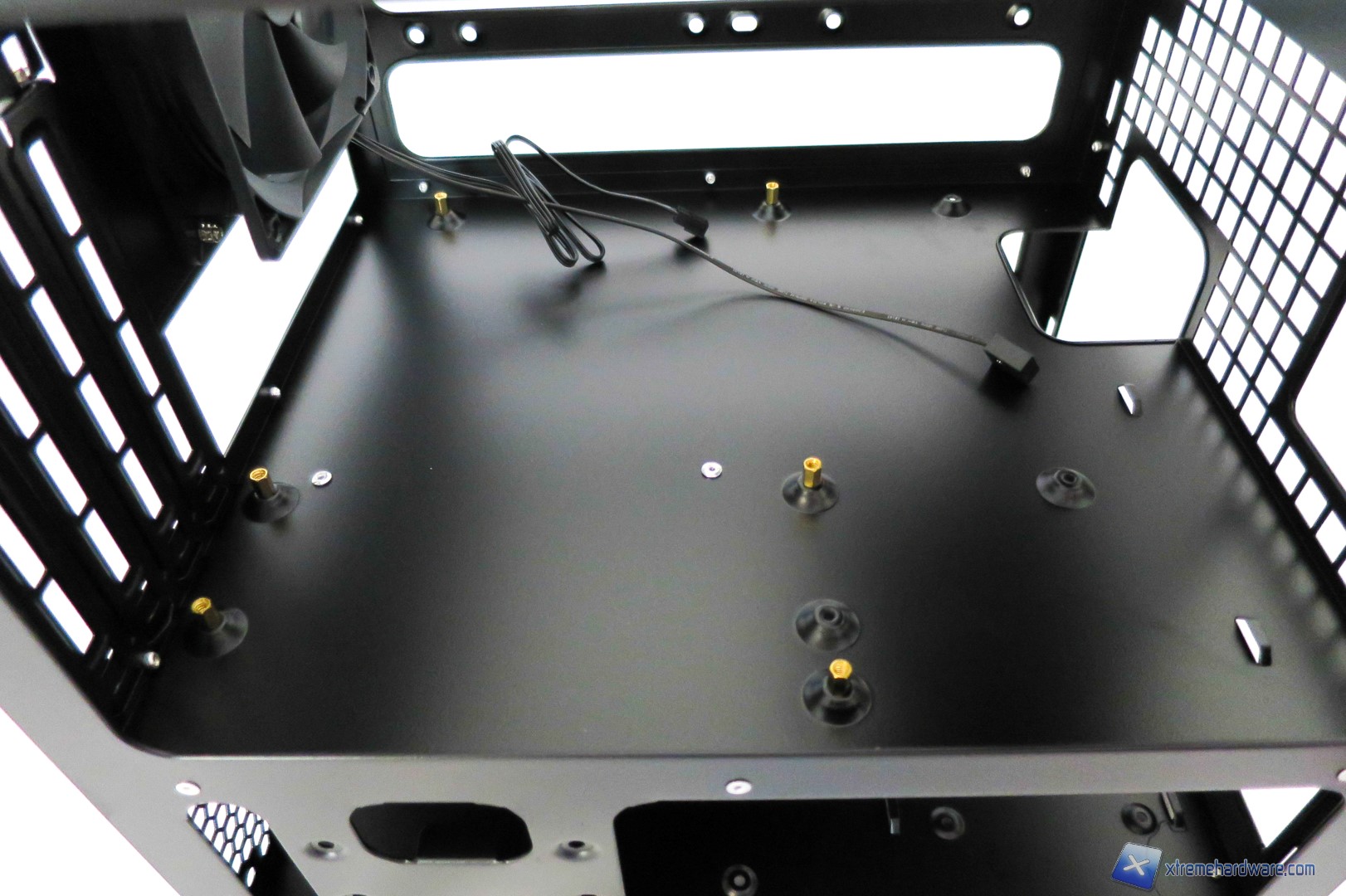 Il tray è già dotato di stand-off per l’installazione di una madre Mini-ITX. Per il formato mATX è richiesta l’installazione di due ulteriori standoffs inclusi nel bundle. Da notare anche come la struttura superiore del case sia dotata di un supporto/tray amovibile tramite delle slitte laterali. Tale supporto ci darà la possibilità di installare l’unità ottica slim e due SSD.