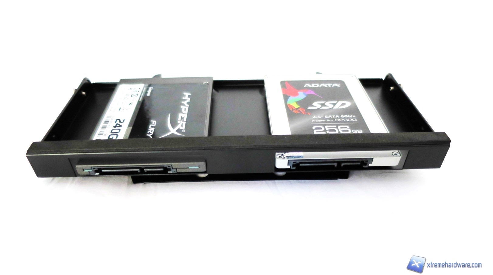 Nel dettaglio vi mostriamo il tray caratterizzato da otto fori per l’installazione di due SSD e da relativi fori posteriori per far passare i cavi SATA dati+alimentazione. Facciamo notare anche le quattro viti che tengono il supporto per unità ottiche slim. Rimosse queste ultime potremo recuperare spazio eliminando l’unità ottica, sostituibile con un’unità ottica esterna o con pen drive.