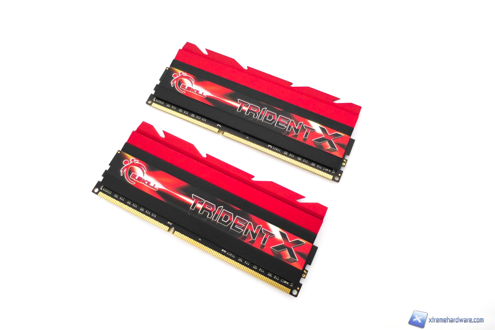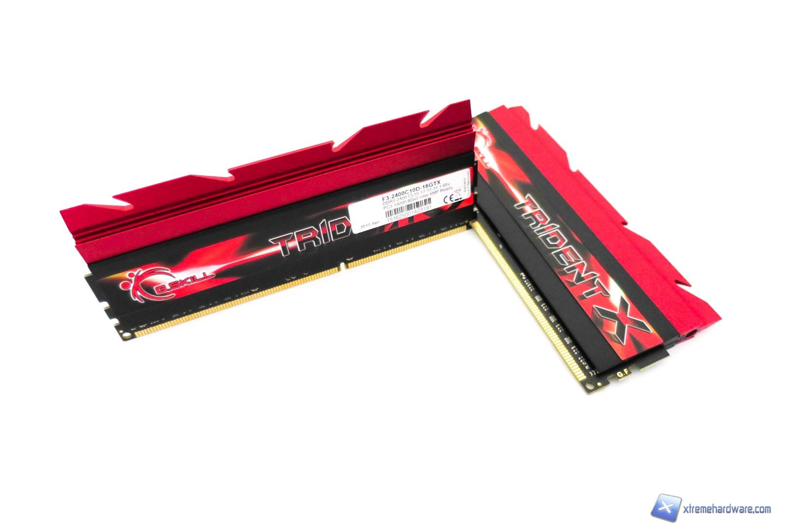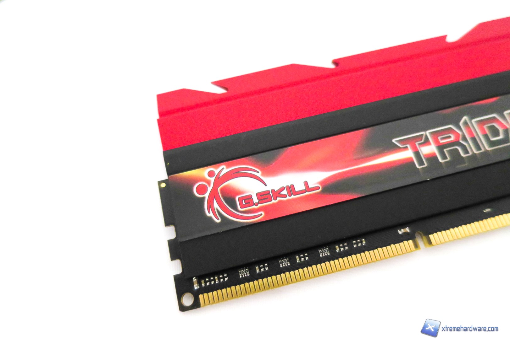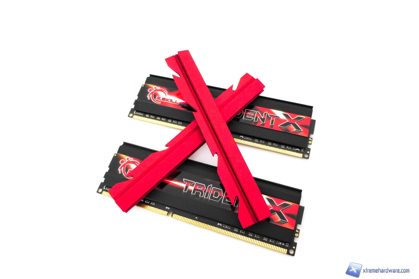 Passando ad analizzare il kit, come sempre il design e look della serie TridentX sono ai massimi livelli. G.Skill è rinomata non solo per la qualità e le prestazioni dei propri prodotti ma anche per il design che sceglie per i propri kit. Le TridentX hanno un design aggressivo grazie alla colorazione nera e rossa e ad heatsink frastagliati, che come vedremo a breve potranno anche essere rimossi. Ricordiamo già da adesso che l’intera struttura di dissipazione dei chip di memoria e degli heatsink è realizzata da un singolo blocco di alluminio. Infatti, prendendo in mano un singolo banco di memoria potremo notare il peso e la qualità con cui G.Skill realizza i diversi kit di memoria. Non manca in abbinamento un PCB totalmente di colore nero da cui parte la colorazione finale di questi Kit.